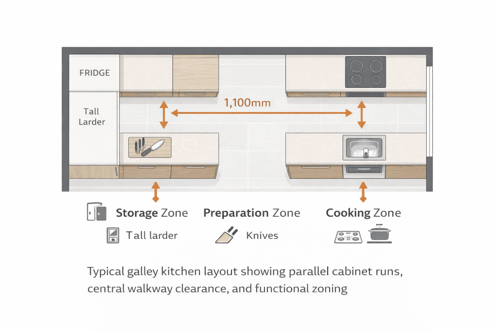 A galley kitchen layout is a kitchen design made up of two parallel runs of cabinets and worktops with a walkway between them. It is designed to maximise efficiency in narrow or elongated spaces by keeping storage, preparation, cooking, and cleaning zones close together. Galley kitchens are particularly well suited to UK homes where space is limited and workflow is a priority.